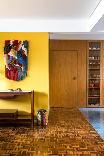 O espaço comum do apartamento se desenvolve na integração da sala de estar, sala de jantar e cozinha. Nas salas, a textura do piso de tacos de madeira que foi revitalizado encontra os planos coloridos das paredes que recebem pintura terracota e mostarda. A cozinha se diferencia pelo piso de ladrilho hidráulico azul que contrasta com o avermelhado da ilha feita em serralheria. Painéis e armários de madeira abraçam esses espaços conectando-os e trazendo aconchego. O resultado é um espaço dinâmico e alegre para receber convidados.