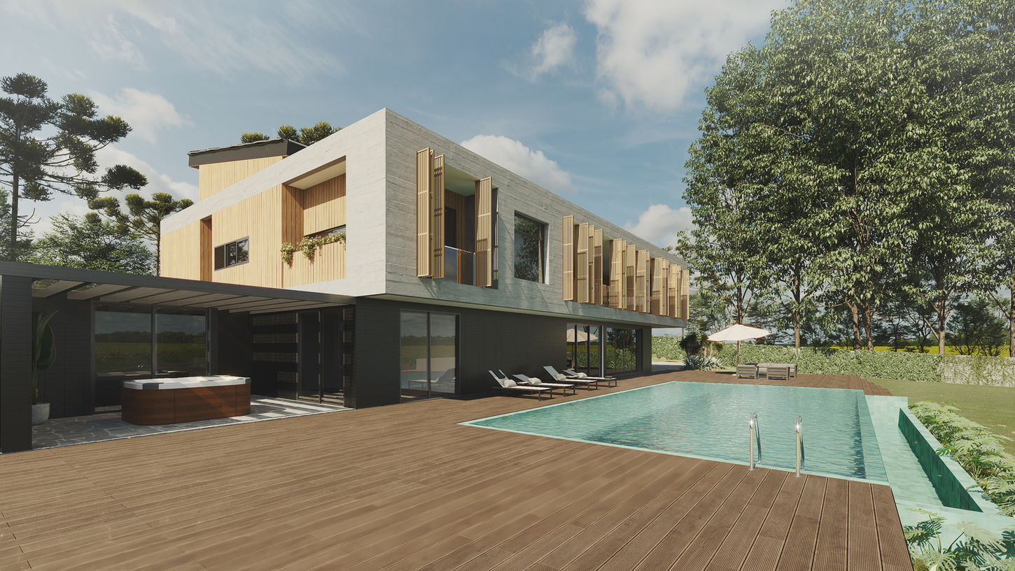 No subsolo, garagem, sauna e sala de jogos são voltadas para a piscina e deck de madeira, a fim de promover a integração visual e funcional destes ambientes.
